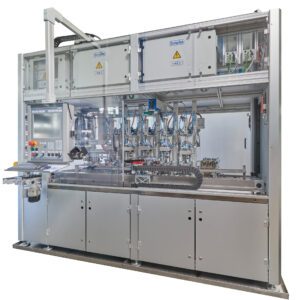 The stations are automatically loaded and unloaded via a conveyor interface to the